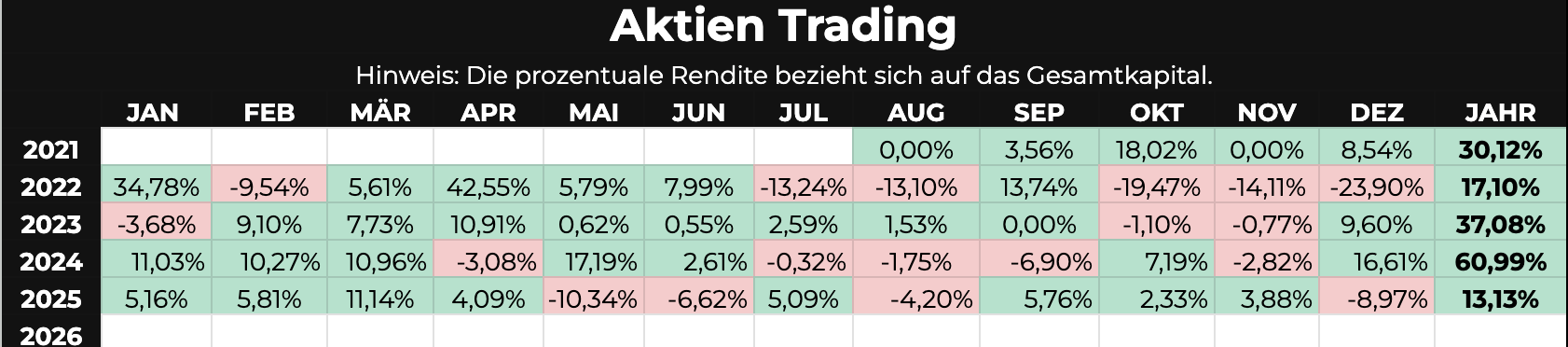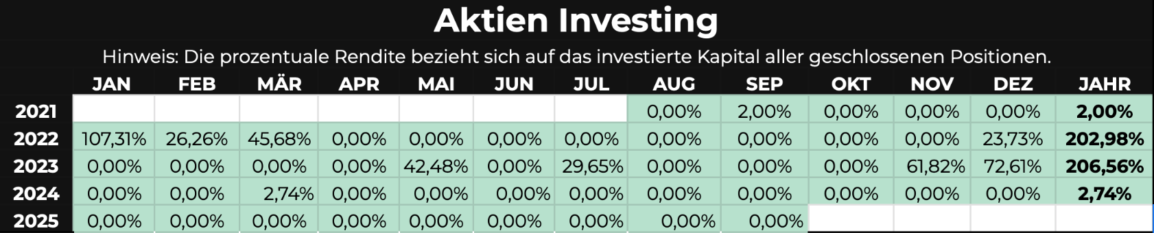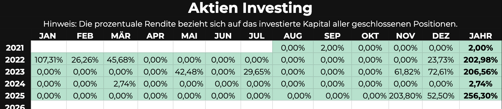 Hinweis: Die ausgewiesenen Ergebnisse wurden auf das jeweils investierte Kapital erzielt.Die vergangene Performance ist kein Indikator für zukünftige Ergebnisse.